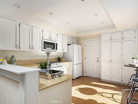 Highly coveted but hard to come by single-level home! Interior cul-de-sac location inside the Woodbridge “loop” and close to the lake. The light and bright kitchen showcases white custom cabinets, Corian counters, recessed lighting, a gas range, brand new microwave, a pantry and loads of storage space. The pristine kitchen opens to the great room with cathedral ceiling, skylight, wood flooring, recessed lighting and a fireplace with a custom stone veneer and wood mantle. French doors lead to the secluded backyard. Large primary bedroom with vaulted ceilings, ceiling fan and spacious dual mirrored closets overlooks the very private backyard. Remodeled bathroom featuring custom tile shower with glass enclosure, a separate soaking tub and a newer dual vanity with granite countertops. The second bedroom also has a high ceiling, wood flooring and a ceiling fan. The second full bathroom has been nicely updated with a walk-in shower and pedestal sink. This move-in ready home also features dual pane windows and a two car direct access garage with parking and storage. The laundry area is located in the garage. Fantastic Woodbridge resort-style amenities include 2 lakes with sand beach lagoons, boating & fishing, 20 pools, 20+ tennis courts, playgrounds, parks, splash pad, fitness course, and a multitude of family-friendly activities. Award-winning schools all in easy walking distance. NO MELLO ROOS!! Low HOAs!!