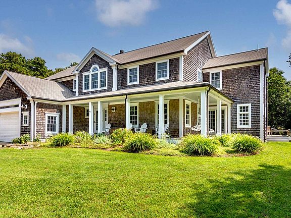 THIS CHIC, CUSTOM- BUILT HOME is at the end of a cul-de-sac offering privacy and tranquility. The uncompromising quality has been meticulously maintained. Enter into the front foyer and immediately experience the designer details throughout. The first floor features a formal living room with vaulted ceilings, stone fireplace, and French doors leading to the screened-in porch. The wall of windows brings plenty of natural light into the open dining/kitchen with commercial appliances, a center island, breakfast bar, and granite counter tops. The dining area flows to the expansive outdoor living space with screened porch for those warm summer nights of outdoor entertaining. There is an additional spacious TV/living area and half bath included on the first floor. One of two Primary Bedrooms is also on the first floor. It features an en suite bath and sliding door to the screened porch. The additional 3 Bedrooms are located upstairs. The second floor Suite has vaulted ceilings, sitting area and deluxe en suite bath with soaking tub and glass walk-in shower. Two other Bedrooms share a generously sized full bath. The second floor landing is an open Media Lounge with window seat, gas fireplace and plenty of space for a comfy sectional and large screen TV. Outdoors, a mahogany deck with tranquil views across the backyard and surrounding woodlands provides the perfect space for outdoor lounging and dining. Take a few steps down to the outdoor Living Room, featuring a blue stone patio and custom wood-burning fireplace. Top it all off with a wrap-around front porch, a place for additional relaxing shaded from the sun. There is an outdoor shower for a rinse after a day at the beach. An oversized garage houses all your Vineyard toys, from beach chairs to paddle boards. An unfinished full basement contains a custom built wine cellar. This property has a strong rental history with repeat tenants to help defray the costs of owning this dream home. Don’t miss out on this rare private oasis centered between South Beach and the charming village of Edgartown! Start making your Vineyard memories today. Easy to show. Contact agent for appointment. *by 10/15: Rentals will be in place for 2023.