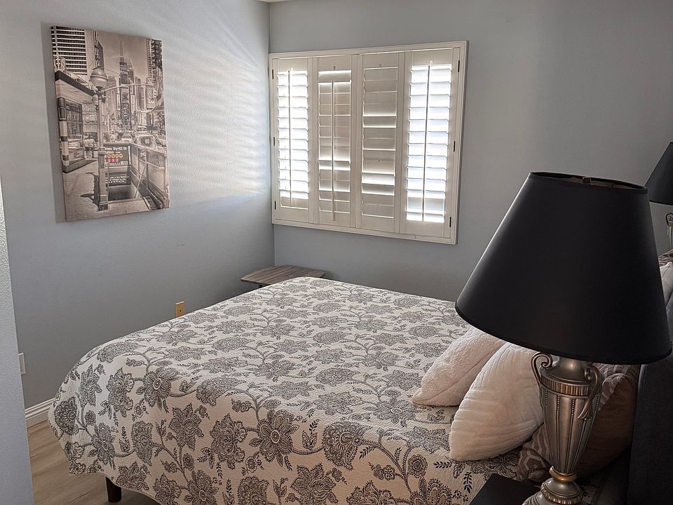 * Fully furnished with a comfortable memory foam mattress (Queen), upholstered bed, two nightstands, two lamps, side table, and wall art