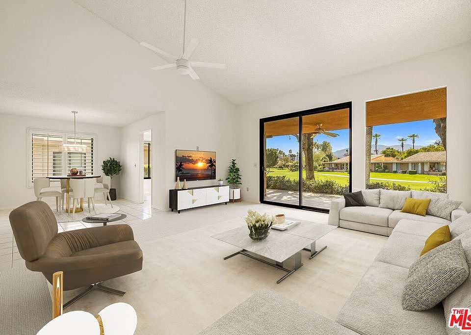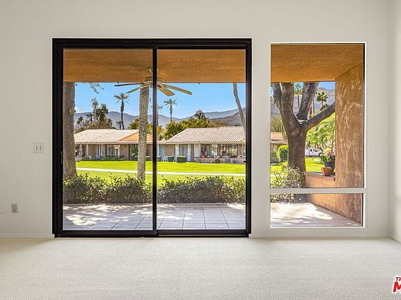 Sunrise Country Club is impeccably sited within its beautiful golf course community surrounded by panoramic mountain views, gated with 24 hour security in sought after Rancho Mirage. This 3 bedroom 2 bath end unit offers abundant natural light with an open concept great room with vaulted ceiling, featuring a spacious living room, dining with enclosed atrium featuring a wet bar, a covered terrace is accessible through wall of glass where lounging or outdoor dining enjoy link and fairway views. Additional features include an inside laundry room and an oversized garage with room for a golf cart and ample loft storage area. The architectural clubhouse includes a bar and grill, lounge, grand dining room with stunning lake and fairway views offering lunch and dinner, the club includes the 18-hole golf course, tennis and pickle ball courts, abundant swimming pools/spas and fitness center. Updates through the years include energy efficient dual glazed windows and Fleetwood slider. First class dining and shopping and medical are conveniently located within easy reach.