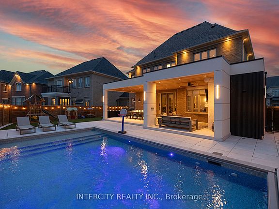 Welcome to 8 Larkin Ave, Luxury Living in Nobleton! This executive home sits on a premium 64 x 112 ft lot and offers 3,216 sq ft above grade finished plus 985 sq ft finished basement, along with over 550 sq ft of covered outdoor loggia featuring top-quality finishes throughout. Features include hardwood floors, pot lights, crown mouldings, open-to-above living room, and a chef-inspired kitchen with stainless steel appliances and large centre island. Upstairs boasts a primary suite with 4-pc ensuite & W/I closet, plus additional bedrooms each with their own ensuite. The fully finished basement includes a custom second kitchen and wine cellar. Enjoy resort-style outdoor living with an inground pool, custom loggia with built-in fireplace, outdoor living area, washroom, and shower. Located in one of Nobletons most prestigious communities, this home is the total package.
