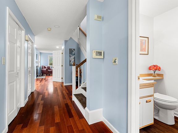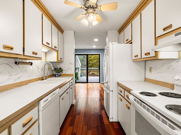 Welcome to this desirable 2–3 bedroom, 3 bath townhouse in the sought-after Ledgewood Hills community, surrounded by beautifully landscaped grounds and offering scenic views from every window, slider, and deck. The fully applianced kitchen features a charming breakfast nook with a skylight, while the spacious dining room opens to a large private deck overlooking a flat backyard with privacy trees—perfect for entertaining or relaxing. The living room boasts Malaysian Rosewood floors and a cozy wood-burning fireplace. Upstairs, the primary bedroom includes a palladian window, ceiling fan, walk-in closet, and an ensuite bath. Laundry is conveniently located in the hallway. The finished walk-out lower level offers a large L-shaped family room or office with sliders to a private backyard and a full bath—ideal as a third bedroom, guest suite, or home office. Additional highlights include energy-efficient heat pump technology to keep electric bills low year-round, hardwood floors, fresh paint, and recessed lighting throughout the home. Conveniently located close to everything—this opportunity truly doesn’t get better!
