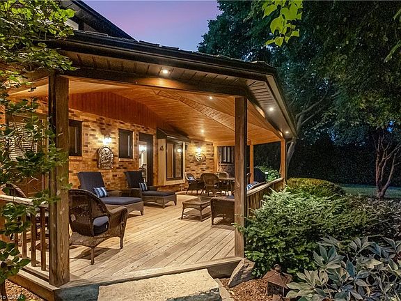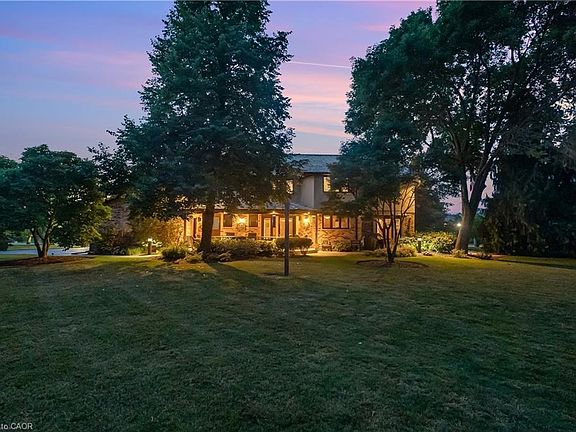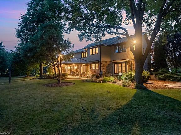 LUXURY-ONE ACRE LOT with a total living space of over 5400 sq. ft on municipal services. 4 Bed |2.5 Bath, custom-built home, steps from Lake Ontario | Fifty Point Marina. Thoughtfully upgraded-offers peace of mind. Over $150,000 in 2025: New Roof (50 yr warr) & Skylights, sump pump, freshly painted interior, renovated garage w/new epoxy-coated finished floor. Imported hardwood floors - touch of timeless elegance throughout. Soaring foyer exudes peaceful luxury. Chef’s eat-in kitchen-heart of the home, SS appliances, wine fridge, & luxurious granite countertops. Premium main floor family room w/soaring vaulted ceilings, a wood-burning fireplace w/natural brick surround offers an elevated layout rarely found. An impressive entertainment area, its architectural scale & warmth make it a standout highlight of the home. The expansive master suite, which includes a spa-inspired 5-piece ensuite w/a stand-alone tub, a rejuvenating spa shower, heated floors, & granite finishes, boasting a custom walk-in closet designed for the most refined tastes. Three additional bedrooms offer privacy & comfort for family & guests. The lower level offers a remarkable rec. space, complete w/pool table, mounted flat-screen TV & integrated surround sound system, gym & ample storage areas, w/ potential for conversion into an in-law suite. Large portico/BBQ area, al fresco dining & entertaining. Expansive backyard hosts a variety of trees, professionally landscaped, potential for further customization, create your dream outdoor oasis. The grounds are a masterpiece of nature, w/private sitting areas, & fire pit. The home also includes a 22,000 WT Generac generator. Conveniently located near top-tier amenities, QEW, easy reach of Toronto Airport and Niagara’s world-renowned wineries. This quiet cul-de-sac provides the ultimate family-friendly sanctuary. This is more than a home - it’s a lifestyle of peace, privacy, & unparalleled luxury with views of Lake Ontario.