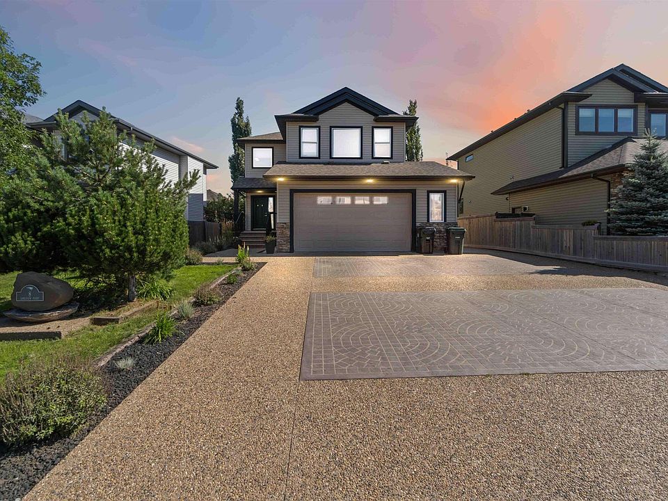 Experience a space designed for the way you live today in this beautiful two-story residence in the sought-after community of Stoneshire. The heart of the home is an open-concept kitchen, featuring sleek stainless-steel appliances and an inviting layout that flows effortlessly into the living and dining areas, all bathed in natural light from big, beautiful windows plus central A/C. 3 generous bedrooms, a convenient main-floor laundry, and an impressive media room for ultimate relaxation, this home is built for family functionality. Step outside to find an expansive deck, perfect for entertaining, all set within a low-maintenance yard that gives you back your weekends. The oversized garage and a long aggregate driveway with dedicated RV parking ensure plenty of space for vehicles and toys. Located moments from the renowned Links Golf Course, with scenic walking trails, playgrounds, and easy access to local schools and shopping, this property is ready to welcome you home-come take a look.