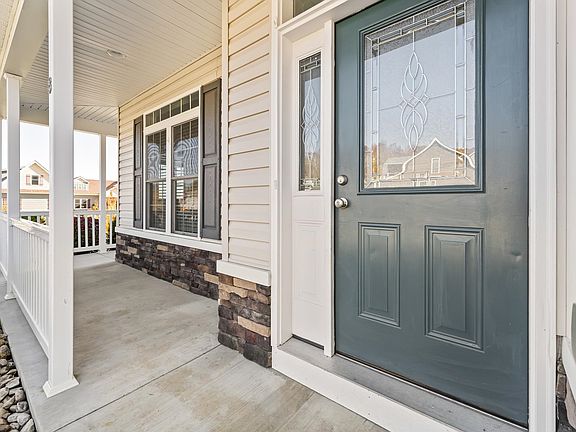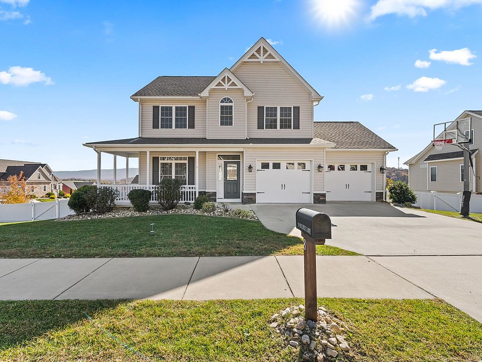 Welcome to this beautifully crafted custom home, perfectly positioned on a level, fenced corner lot in the desirable Riverheads District. A charming wraparound front porch invites you in and extends to the fenced backyard, where a spacious deck and patio area create the perfect setting for entertaining family and friends. Step inside to an impressive entryway featuring a staircase and gleaming hardwood floors that flow throughout the main and second levels. The open-concept layout showcases 9-foot ceilings, a cozy gas fireplace, and a bright living room seamlessly connected to the kitchen and dining area. Step out onto the covered 12x12 deck and take in breathtaking mountain views while enjoying your morning coffee. Upstairs, you’ll find two generously sized bedrooms, a full bath, and an exceptional primary suite. The owner’s retreat features elegant tray ceilings, a luxurious ensuite bath, and an attached bonus room—perfect for an office, dressing room, or additional storage. The enormous walk-in closet is truly a dream come true! The finished walkout basement offers even more space with an additional bedroom, full bath, rec room and family room. Thoughtfully designed and meticulously maintained! Freshly painted and ready to go!