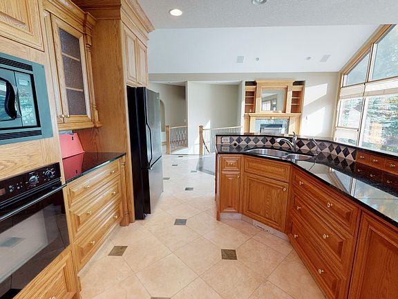 The main level is bright and open as you enter this spectacular home. The living room holds a gas fireplace and vaulted ceiling, next to the dining area with access to the patio and view of the golf course. The kitchen holds recessed lighting, an island with raised breakfast bar, granite counter tops, black high end appliances with names such as Bosch, and oak cabinets. The laundry room is just off the kitchen with built in Bosch washer and dryer. The master bedroom is on the main level with built in armoire, an ensuite with 2 walk in closets, a corner tub, double vanities and sinks, separate shower and tiled countertops. The lower level has a large rec. room with built in entertainment centre, another bathroom with a cheater door off one of four other bedrooms. There is a storage area with shelving, and an extra fridge and freezer. Other features of the home are heated double attached garage, heated tile floors, built in speakers, 9' ceilings, satellite dish, and video surveillance and evening guard for the community.