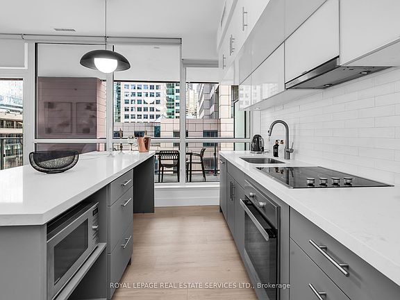 Welcome To The Mercer! This Gorgeous Rare Corner Suite Features Floor To Ceiling Windows And An Extra Large Covered Outdoor L Shaped Terrace. The Majority Of The Terrace Faces East Allowing For Bright Natural Light And Views Of The Queen Elizabeth Theatre To The North And Roger's Centre To The South. This Boutique Stylish Unit Features $50,000 Worth Of Upgrades Including New Floors, Interior Doors, Baseboards, Kitchen Cabinetry, Kitchen Sink, Lighting Throughout, Kitchen Island, Quartz Countertops, New Cooktop, Kitchen Backsplash, Bathroom Vanity, Bathroom Lighting, Bathroom Fixtures, Bathroom Sink, And Fresh Paint Throughout The Entire Suite. The Large Open Concept Kitchen Features A Huge Island With Room For Four Counter Stools For Entertaining, A Miele Fridge, Miele Oven, And Microwave. The Unit Has A Great Hallway Entrance With Large Storage Cabinetry And A Coat Closet. The Unit Is Close To The Staircase For Easy Exit From The Building. It Also Includes A Storage Locker. Move In Ready! Top Of The Line Amenities Include A Gym, Party Lounge, Sauna, Jacuzzi, And A Beautiful 10,000 Sq Ft Rooftop Terrace. Steps To The PATH, St. Andrew Subway Station, TIFF, Roy Thomson Hall, Financial District, Top Restaurants And Everything The King West And Entertainment District Has To Offer.