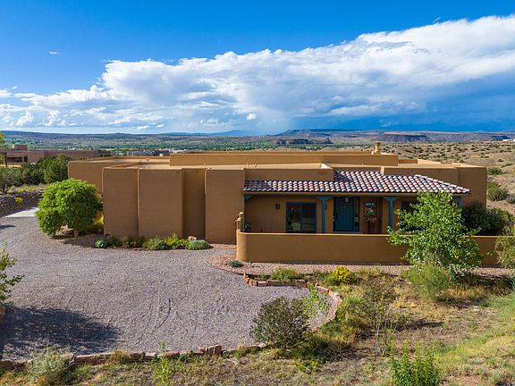Furnishings available! Beautiful custom-built single-level home inspired by the views and beauty of New Mexico. Whether you're a culinary enthusiast or a casual cook, the kitchen provides the perfect backdrop for creating delicious meals. The large eat-in kitchen has walnut cabinets, a center island with bar seating, stainless steel appliances, gas cooktop, granite countertops, custom-made floating shelves, stunning wrought iron light fixtures, and a lighted glass front wall of cabinets making everything easy to find. You are greeted by a gallery hallway with lighted nichos to display your collection. Carved vigas & southwest accents throughout the design of this home. The grand living and dining room features a custom fire place, large windows, & door that frame the mesa views perfectly.