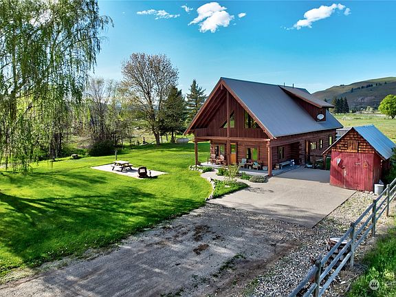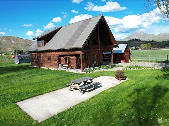 Embrace the quintessential country living experience! This incredible 2-bdrm, 2-ba 1500 sqft log home sits on 2 sunny acres, offering a serene & picturesque setting. The vaulted ceilings & open floorplan create a spacious & inviting atmosphere, while the tasteful kitchen features granite countertops and stainless steel appliances. The main level includes a bedroom & 3/4 bath, while the large loft bedroom upstairs is accompanied by a full bath. The home is equipped with new ductless mini splits. The property boasts 2 outbuildings and a rustic barn. The green yard and breathtaking mountain views add to the charm of this property. Includes two tax parcels, ensuring ample space, privacy, and room for future development, just 2 miles from Twisp.