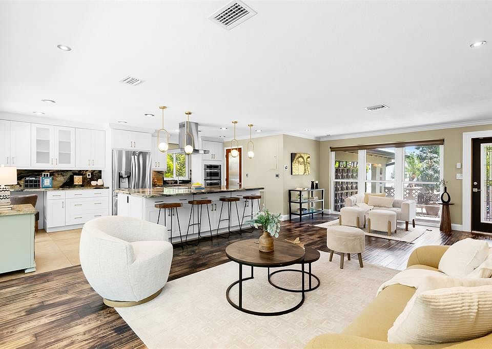 Fully updated stunner offering a bright, open-concept layout with a Florida room overlooking the private pool and lush backyard. Chef’s kitchen with high end cabinets, soft-close drawers, top of the line appliances, and expansive counter space.