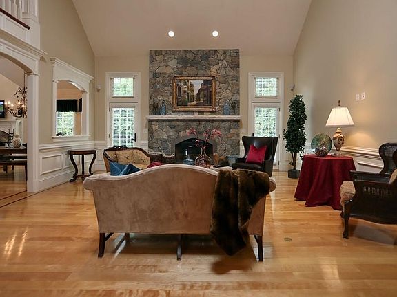 Unrivaled architectural design captivates discriminating buyers w/ stone front, magnificent gables, hip-roof lines, chimneys, and estate-like setting. Offered by original owners. Thoughtfully executed home anchored by 2-story foyer w/ coffered ceiling and adjacent family room w/FP. Gourmet kitchen also has a gas FP for comfortable living/entertaining. Architectural details: hardwood and marble flooring; double-turned staircases; elegant ceilings, custom millwork; quality built-ins. Natural light provides warm and welcoming ambiance. Rear courtyard abuts conservation land. Richly finished, cabinet-packed kitchen w/ oversized, granite-topped, center island. High-end SS Viking gas range, wall ovens, dishwasher, Sub-Zero refrig.; 1st-floor master w/ double vanity and walk-in closets. Private 1st-floor office with faux-leather cath. ceiling. 4 BRs, 4.5 baths. Heated 3-car garage. Fin. LL w/ 2 lge rooms, kitchenette, full bath that could be converted to in law apt with permit from town.