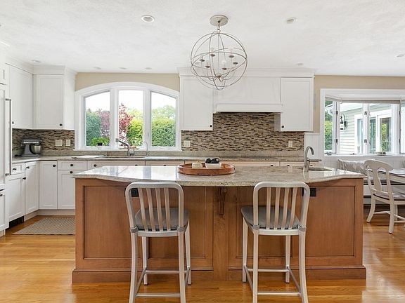 Large immaculate Colonial in move in condition on cul-de-sac. Southerly exposure with large farmers porch, superbly manicured landscaping and expanded driveway. Completely remodelled kitchen with Miele & Subzero appliances including steam oven, beverage & warming drawers. Kitchen opens to large cathedral ceiling family room with floor to ceiling wood fireplace. Primary bedroom with renovated in-suite full bathroom and an additional 3 bedrooms & fully renovated 1.5 bathrooms. All rooms feature hardwood or tile flooring. Expansive Great Room over 2 car garage. Four Season Florida room with wrap around deck overlooks entertainment rich private yard featuring hardscape patios and wall, an in-ground heated pool, large roof covered patio, large pavilion, putting green, pool equipment and storage shed. Finished basement (not included in sq footage) includes additional full bath, Central VAC, and complete AV system with multi-room audio. Move right in and enjoy the beautiful yard this summer