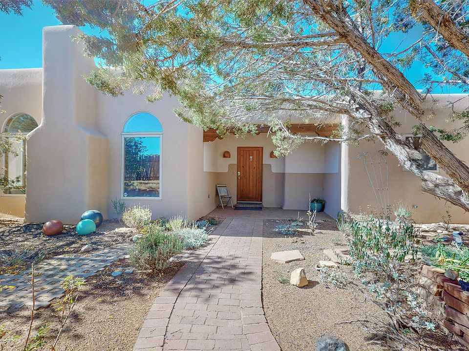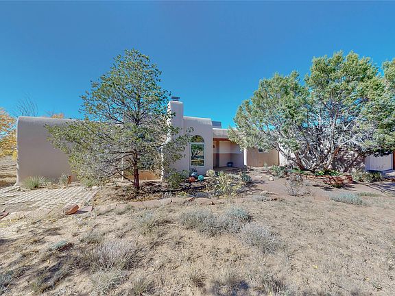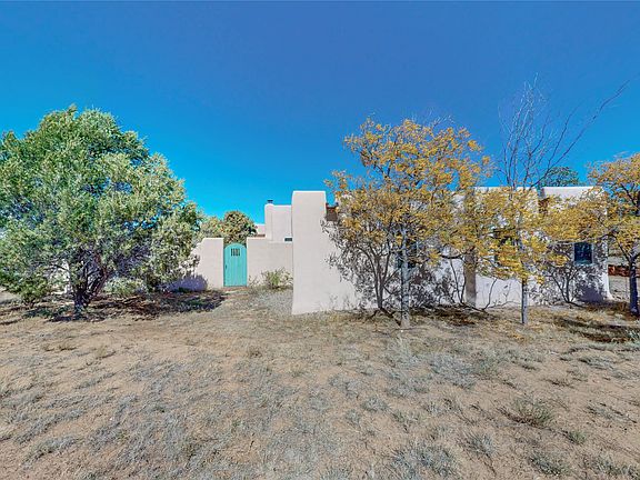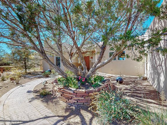 Gracious light open plan, 2230+ sq.ft. split bedroom design built by Adobeworks sitting high up on a cul de sac in Eldorado. Contemporary pueblo with high viga ceilings, dramatic custom kiva fireplace, nichos, corballed beams and tile floors in main living areas. A sunny large kitchen with island and pantry flows to a formal dining area with outside portal for dining with fabulous sweeping sunset mountain vistas . Owners suite features a romantic corner kiva and viga ceilings with a door to a privately walled garden and bath with walk in closet, separate shower and tub. There is a lovely library/music room with a central Rumford style fireplace and 2 bedroom, full bath guest suite. Close to both Eldorado amenities and local community services, trails and shopping plus only minutes into Santa Fe. This home is a must see.