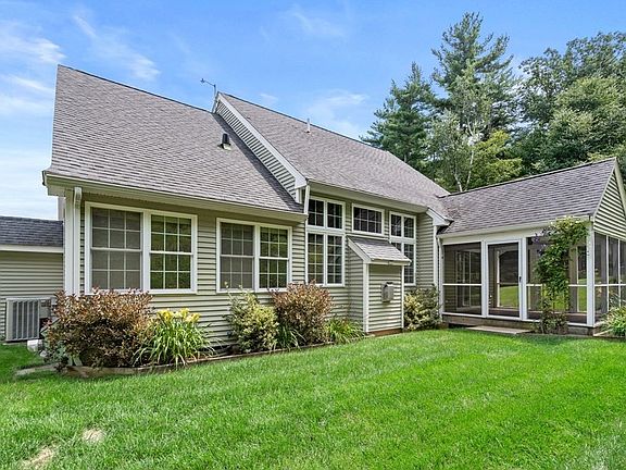 Welcome to the idyllic VILLAGE AT REED MEADOW a 55+ ADULT Community 12 units-6 Detached Homes on private lots w/ Home Owners Assoc low mthly fee of $225. covers landscaping, snow & trash removal-plus 6 Condex units in 3 Duplex units w/Condo Assoc. Complex is in pretty country setting abutting 220 Ac Oak Hill Conservation land w/miles of trails..a nature lover dream! 8 REED LN is a beautiful DETACHED home situated on .31 Ac lot in lovely setting abutting conservation Ld. Features sunny open floor plan, 2 story Foyer, hardwood flrs, stunning cathedral ceiling Great Rm w/ gas fireplace, balcony & amazing window wall viewing gardens & woodlands. Warm & inviting granite Kitchen open to Dining Rm w/ bay window & glass door to wonderful Screen Porch. 1st Fl Main Bedroom has tray ceiling, wall of windows view gardens, Lg Walk-in Closet & deluxe Tiled Bath w/big shower. 2nd Fl has Guest Bedroom & Full Bath, Office & Media Rm w/ custom built-in. Area has train to Boston, shopping & restaurants
