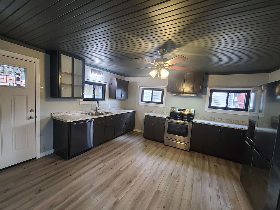 This charming and completely renovated 3 bedroom, 1.5 bath house features a car port, porch, spacious living room and bedrooms, laundry room with washer/dryer, a modern eat-in kitchen with lots of cabinets and new stainless appliances. The house is situated in a quiet, friendly neighborhood that is a short distance to the hospital and the downtown shops and restaurants. Pre-application, background checks and proof of adequate income is required. One-year lease is required. Monthly rent includes Water, Sewage and Trash. Tenant is responsible for all other utilities. A smaller dog maybe considered with additional rent and deposit. Small yard maintenance and snow removal is the responsibility of the tenant. Mower provided. This is a strictly non-smoking house.