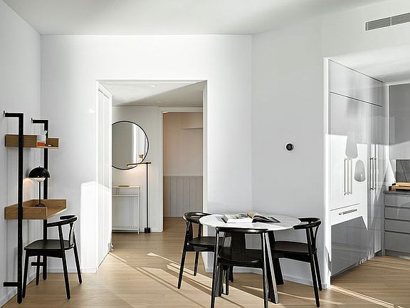 Italian kitchens come in two distinct palettes with warm tones featuring teak cabinetry, Carrara marble and oil rubbed butcher block, or cool toned high gloss lacquer paired with Lava Stone waterfall countertops. All homes have a suite of Gaggenau fully integrated appliances including a speed oven and state of the art induction cooktop, as well as vented range hood and wine refrigerator.
