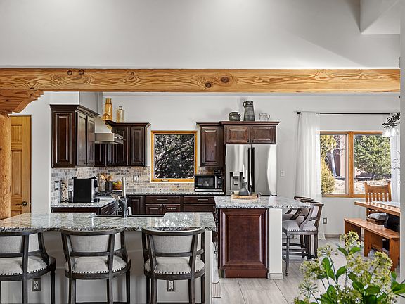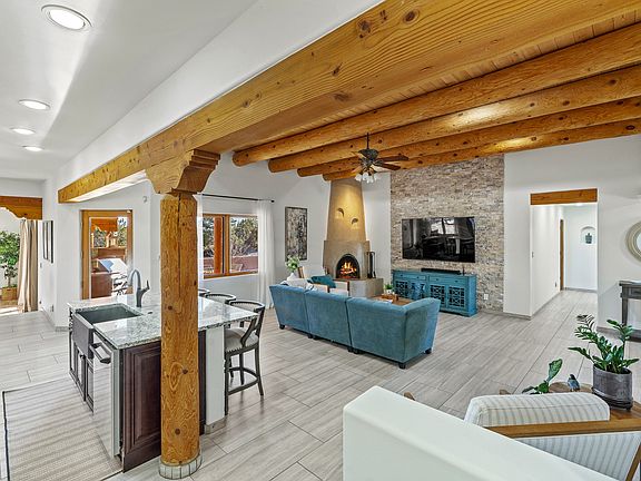 The open-concept floor plan offers effortless flow and versatility. A spacious living room with beautiful viga ceilings and a wood-burning kiva fireplace provides the perfect setting for entertaining. The fully reimagined kitchen features stone countertops, brand-new stainless steel appliances, and two islands—each with bar seating—while the adjacent dining area connects seamlessly to a cozy den with a gas fireplace, creating a warm and inviting gathering space.
