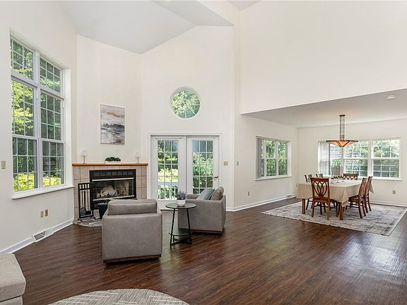 The main home greets you with a formal entry and soaring vaulted ceilings that open into a generous great room anchored by a central fireplace—an inviting centerpiece for gatherings. An adjacent formal dining room offers a warm setting for hosting dinners and special occasions. The bright eat-in kitchen combines everyday functionality with abundant storage, while a main-level half bath just off the entry adds extra convenience. A two-car garage with an adjoining mudroom provides a seamless entry point, making it easy to bring in groceries and gear.