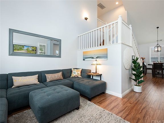 LIGHT AND BRIGHT END UNIT with ATTACHED TWO CAR GARAGE! From the front porch with a little seating area, to the charming interior with soaring ceilings, you'll be won over immediately! Downstairs offers a formal living room, a spacious dining room for wonderful gatherings, a roomy white kitchen with breakfast bar, quartz counters, stacked stone backsplash, and stainless steel appliances, and a cozy family room with a fireplace. The floors are smooth, beach-y laminate and the walls are two modern tones with crisp white moldings - just what today's discerning Buyers are searching for. Up the stairs are the large Master Suite and en-suite bath: a huge soaking tub, stand-up shower, and walk-in closet! Two guest rooms, a sweet hall bath, and the convenient upstairs laundry complete the interior of the home. The wrap-around back yard is a great space for a seating area and a dining table. 8 Sea Pines is a detached condo- no common walls and you have your own back yard- and the landscaping is taken care of by the HOA. This is one of the prettiest communities in the city, with mature trees and neat Cape-Cod style homes. Right outside of the community is Oak Park, the highly rated Canyon Vista Elementary, and just a short distance away is Don Juan Avila Middle School. A quick hop down the street are restaurants, grocery stores (Trader Joe's!) and shops in Aliso Viejo Town Center. Welcome home!