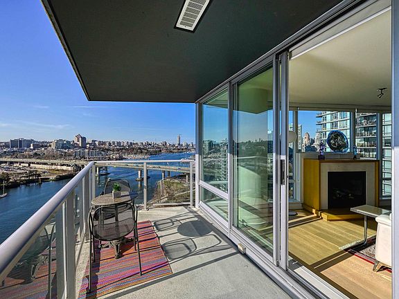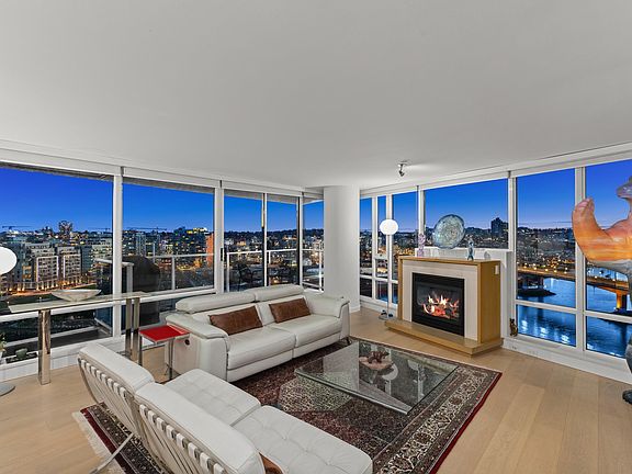 Welcome to Flagship! Enjoy spectacular panoramic views of False Creek. The grand living space, with a gas fireplace and floor-to-ceiling windows, is perfect for entertaining. The modern kitchen features European cabinets, Sub-Zero and Miele appliances, a large island with a 5-burner gas cooktop, and a spacious dining room. The master retreat and ensuite also showcase incredible water views. The layout includes a separated second bedroom with water views. Additional features include A/C, concierge service, and luxurious amenities such as an indoor pool, guest suite, bowling alley, and fitness center. Located on the Seawall, next to Cooper's Park, and steps from marinas, entertainment, restaurants, cafes, and shopping, this rare opportunity includes 1 parking in garage and storage.