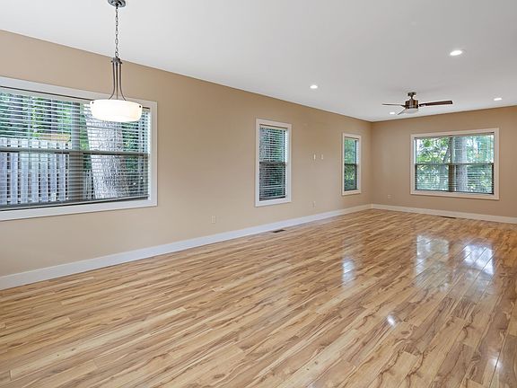 The open plan living and dining room offers abundant windows and natural light, as well as access to the great wraparound covered porch. Attractive hickory laminate flooring is throughout the home, except for ceramic tile in the bathrooms.