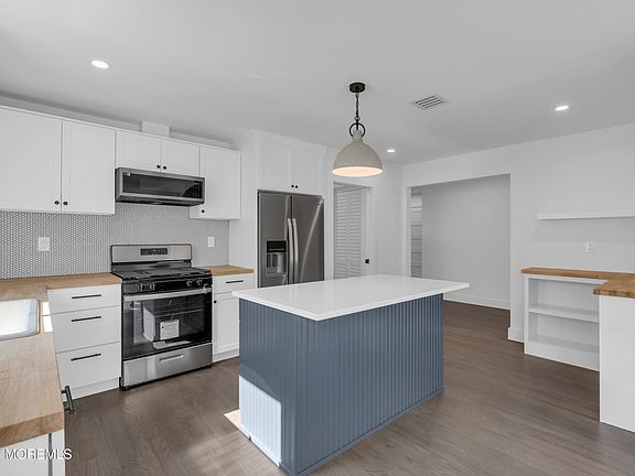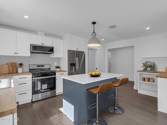 The chef's kitchen features custom cabinets, quartz kitchen island and butcher block countertops, a gas range, pantry, and stainless steel appliances. The primary suite offers a custom walk-in closet and private, fully updated bathroom. Both bathrooms have elegant finishes, including ceramic penny tile, glass shower enclosures, and modern fixtures.