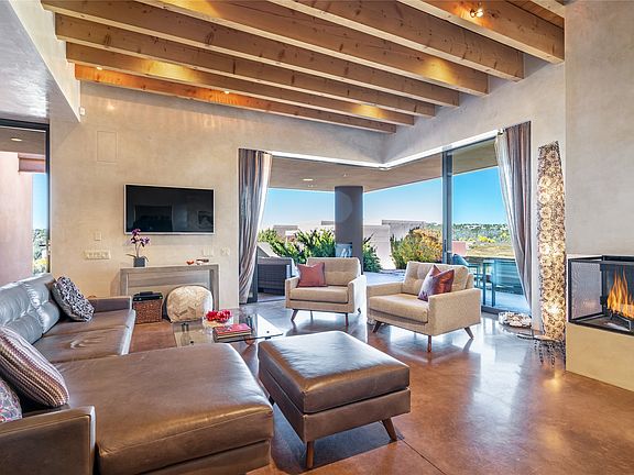 Southwest Contemporary design. Designed by esteemed architect Robert Zachry, AIA, and meticulously crafted by Michael Hurlocker, this 2008 Parade of Homes winner for "Most Creative and Innovative," "Best Craftsmanship," and "Best Exterior Character" will immediately reward. Upon entering through the glass front door, you are immediately aware of the uniqueness of this home. The main living area with dual-sided fireplace and remote-controlled wall-to-wall glass doors seamlessly open to a wraparound portal with fireplace and custom-built wall water feature, providing the perfect indoor-outdoor luxury retreat. The modern and elegant kitchen, adorned with sleek cabinetry and high-end finishes, island seating, informal dining area and private patio ideal for outdoor grilling and gatherings. This home is also equipped with modern comforts, such as central air conditioning, radiant in-floor heating, spa like bath, solar panels for hot water heater and heating, cistern for watering the professionally landscaped grounds. Every aspect transcends time. It's not just a home; it's a statement of enduring excellence. Don't miss this opportunity to own the art of living in a home where innovation, craftsmanship, and style unite to create an extraordinary living environment.