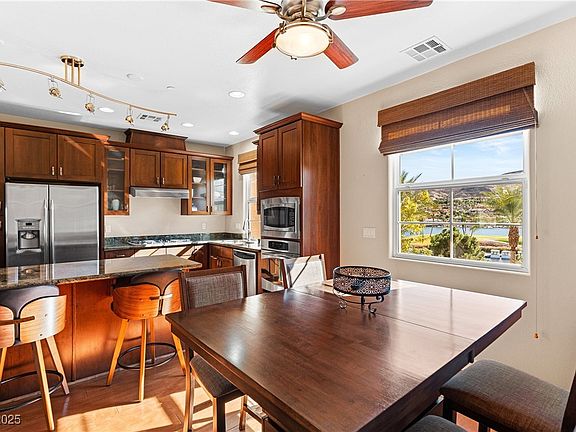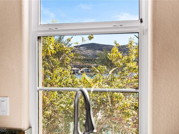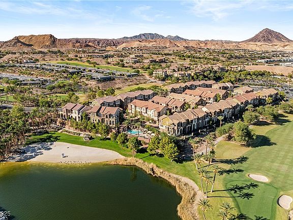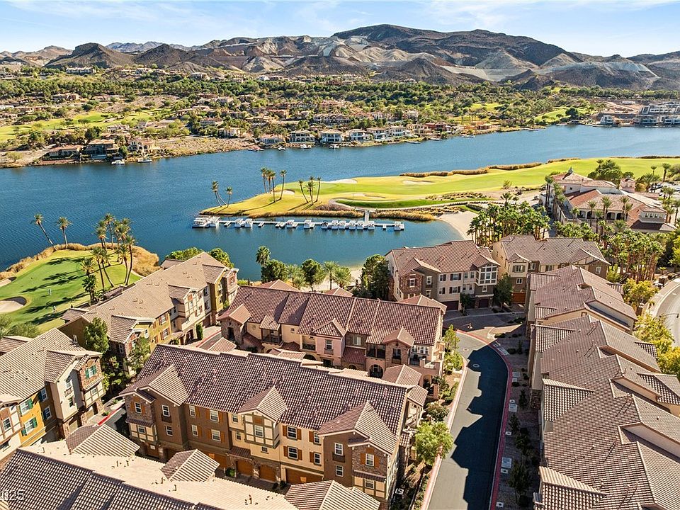 Gated, luxury, immaculate 2-bed, 2.5-bath townhome with spectacular views of the community pool and spa, the adjacent Reflection Bay Golf Course and beach, the boat marina, and expansive Lake Las Vegas. Wake up to coffee with lake views. Enjoy dinner and wine in the dining room overlooking the water. Relax in the living room, open to the kitchen, or unwind in the high-ceiling great room with doors leading to the porch—perfect for cuddling up around the fireplace. Upstairs features a powder room, a laundry room with sink and cabinets, and office built-ins in the loft, centrally located between two double-bed–size bedrooms with ensuite bathrooms. The primary bedroom offers a walk-in closet, balcony, and central community views. A water softener is included in the two-car garage, which also provides generous storage space. Plus, a Lake Las Vegas Sports Club Membership Initiation Certificate valued at $25,000 is offered to the buyer at COE.