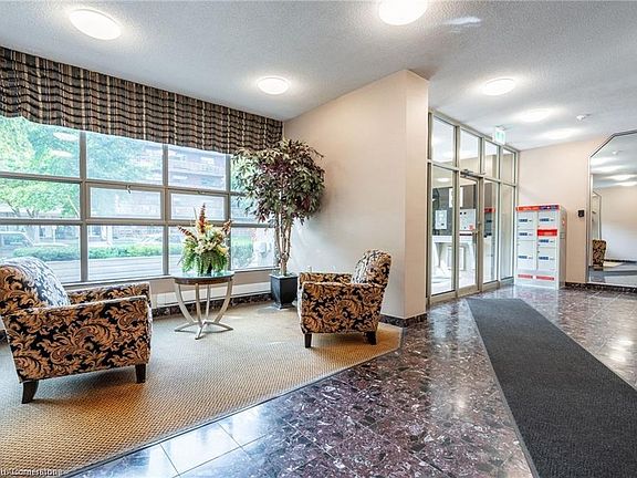 Welcome to Village Green! This well-kept, thoughtfully updated 2-bed, 2-bath,1,310 sqft carpet-free condo unit on the 5th floor is bright and sunny, featuring large windows throughout that fill the space with natural light. The updated kitchen features granite countertops, backsplash, white cabinets, breakfast bar & updated appliances while the separate dining area flows into the comfortable oversized living room. Patio doors lead to your own private balcony with southwest views overlooking the escarpment. The spacious primary bedroom with a renovated 4-piece ensuite is the perfect place to unwind and relax while the second bedroom can be used for family, guests or as a home office. The beautiful updated main 3-piece bathroom and convenient in-suite laundry complete the unit (washer & dryer 2024) Enjoy the many amenities in the building, including an exercise room, party room and sauna, plus more! 1 underground parking space and a storage locker included. Unbeatable location backing onto Hopkins Park with a paved walking trail, rec centre with an indoor pool and arena across the street, tennis courts, close to shopping, dining and easy highway access. Furnace & A/C heat pump updated 2021. Must see to appreciate!