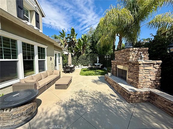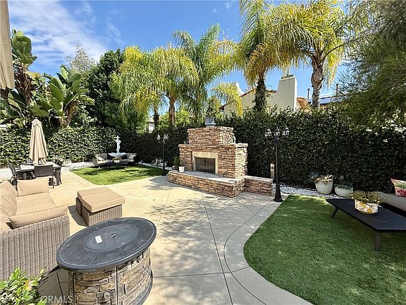 Enjoy a large, private backyard designed for outdoor living stacked-stone fireplace, multiple seating and dining areas, lush hedges, palm trees, and easy-care turf. Additional highlights include travertine and wide-plank flooring, recessed lighting, plantation shutters, indoor laundry, and ample storage.