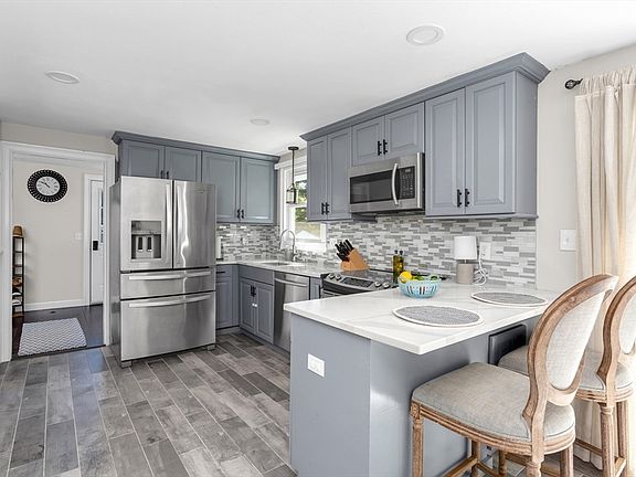 CUTE - AS - A - BUTTON! Seriously.... Let the pictures tell the story. This wonderful 3 bdrm, 1 bath ranch is situated on a .24 acre level lot in a sought after neighborhood just minutes from shopping, restaurants and commuter rail. Open concept floor plan ties the LR (w/ wood burning FP & bump out bay window) & kitchen together which will make family gatherings a lot more fun. New barn door can separate the living space from the bdrm area if/when needed. Updated & cabinet packed eat-in kitchen comes complete with granite, SS appliances, breakfast bar & slider out to a stamped concrete patio area & back yard. 3 generous sized bdrms & updated full bath. Multi use room from side entrance currently used as a combined office, gym, mudroom, laundry & pantry area. Added bonuses: NEW water heater 2022, NEW furnace & central air 2020, oil tank 2018, windows 2016, refinished hardwoods, fresh interior paint, town water/town sewer and so much more. Just move in and enjoy! This is it....
