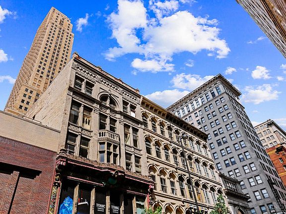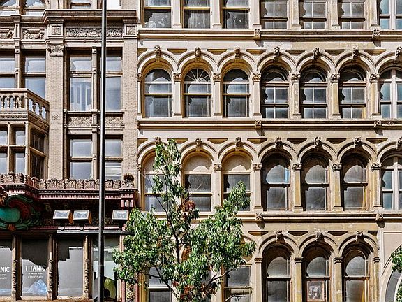 Open span floorplatesHigh ceilingsArched windowsOrnate stone facadeBracketed cornice