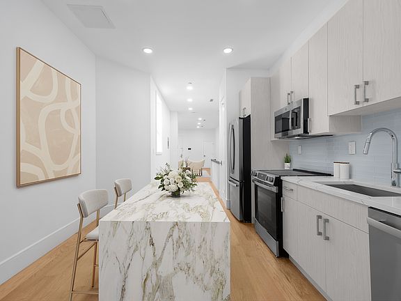 Spanning the first and garden levels, this spacious home features White Oak hardwood flooring, custom cabinetry, central air conditioning and all new appliances set against quartz countertops. Both full bathrooms are marble clad with illuminated mirror vanities, combining timeless design with modern function.
