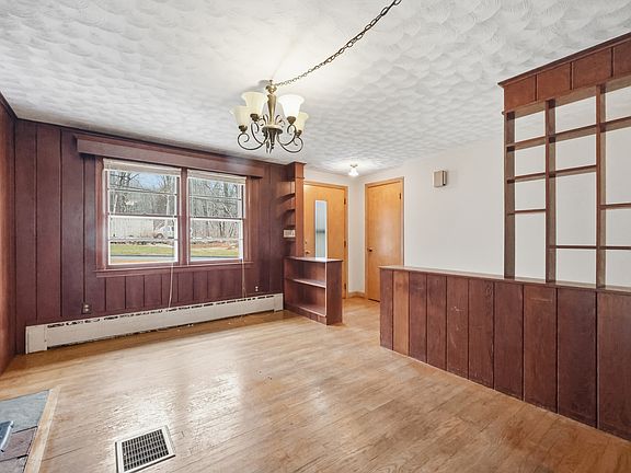 Here is Your Diamond in the rough! Great Opportunity in this 1352 sq.ft. Ranch, with additional 480 sq.ft. in LL waiting for a refresh! Your charming 2-bedroom, 2-bath (one bath beautifully remodeled and the other ready for your personal touch), this home is full of charm and opportunity. Featuring hardwood floors throughout, custom built ins, a cozy wood-burning stove in the see-thru fireplace, with a large open kitchen. Your home is set on a quiet street just off the main road, offering convenience without sacrificing a neighborhood setting. Plenty of potential to build value over time. You'll love the ample storage throughout, as well as the large dry basement just waiting to be transformed into additional living space, a workshop, or a recreational area. The yard is perfect for outdoor play, gardening, or pets. Your home is truly move-in ready, making it a fantastic opportunity for DIY enthusiasts, investors, or anyone eager to update and personalize a home over time. Do not let Your Home slip away-Make offer Today!