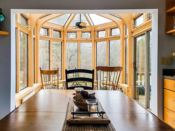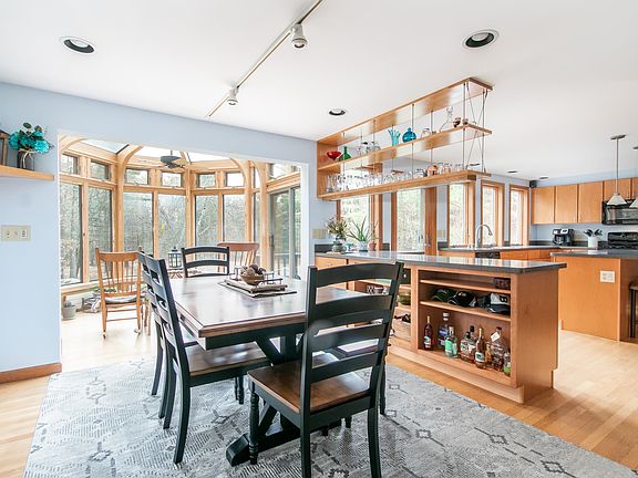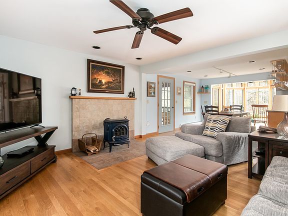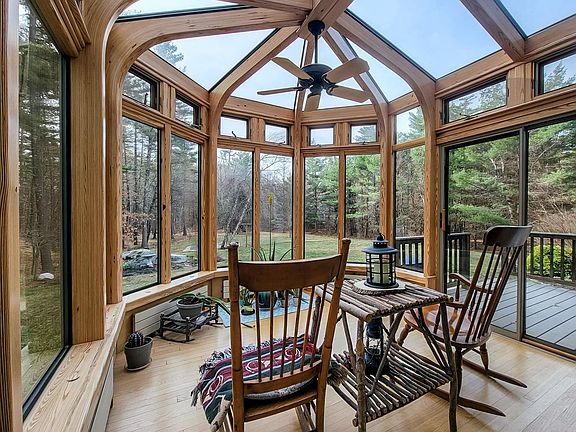 This 3-bedroom, 2 full bath cape on 5.5 acres, backing up to conservation land in the Hollis-Brookline School district is a must see! You'll be impressed by the landscaping & brick walk up to the house. To the left at the front door you'll enter the large living room with cheery wood stove on a tile hearth. Next you'll find the dining room separated from the spacious kitchen by convenient shelving. To the left is the large screened porch with inserts to keep out the weather. The back of the dining room is open to a bright sunroom with gorgeous views of the back yard. Walk out to the deck & patio area for grilling and sit & watch the deer feed in the distance. The kitchen has a wall of windows facing the sunny back yard with raised gardening beds & many perennial plantings. The kitchen also includes a handy island with storage, pendant lighting & Corian counters. There are abundant modern maple cabinets & newer appliances. Use the 1st floor bonus room as a bedroom or office. An updated full bathroom completes the 1st floor. Beautiful hardwood floors on the 1st floor & new neutral carpeting on the 2nd floor. Upstairs is the spacious front-to-back primary bedroom with access to an updated full bathroom. Two good-sized bedrooms complete this floor. Each BR is cooled by mini-splits. The basement includes storage, well-maintained mechanicals, & is walk-out to the large shed. Showings begin at the open house, April 15, 11-1, also April 16, 12-2. OFFER DEADLINE TUESDAY, 4/18, @ 5 PM