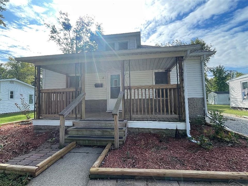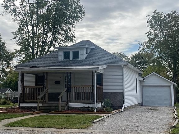 with an abundance of beautiful cabinetry, counter space, huge island with breakfast bar and gas range top, built-in oven, dishwasher, garbage disposal, nice pendant lights and beautiful bamboo flooring. Bath has deep tub with shower and ceramic tile floors. You can enjoy a cup of tea or coffee on the large open front porch or relax in the nice backyard with firepit, large detached 2 car garage with workshop area and also an attached 1 car garage. NOTE: There is a floor level city drain in the partial basement that leads to the city sewer and also a dehumidifier. UPDATES: 2018 ROOF (tear off); GFA and C/A new 2013; 1 car garage new vinyl 2023; hot water heater 2023. MAKE AN APPOINTMENT TODAY TO SEE THIS NICE HOME AND MAKE IT "YOUR HOME"!