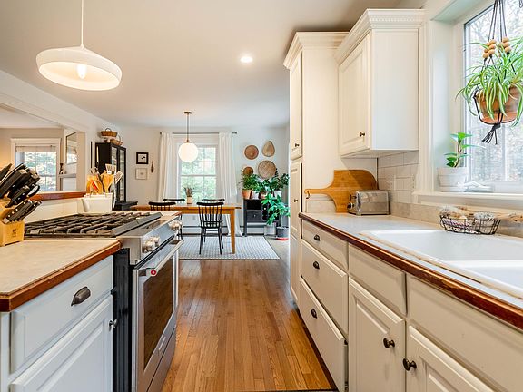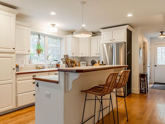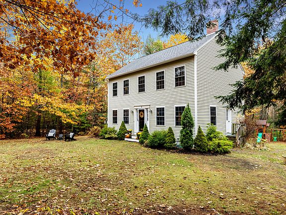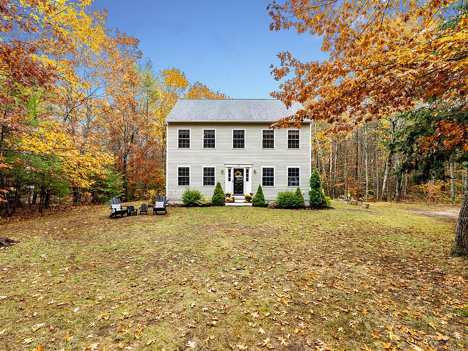 This contemporary colonial in Falmouth has 3 bedrooms, 2.5 baths and modern flair around every corner. The cozy living room is hallmarked with a gas fireplace insert in a shiplap accent wall. The living room opens to the stylish and airy chef's kitchen with updated appliances, center island and eat-in area with sliders to the back deck. The deck leads to a tree-lined backyard offering privacy and versatility with a shed, garden bed and room for more. The property abuts conservation land great for dog walking, biking and admiring Maine's variety of wildlife. A secondary entrance features an inlet for coats and across the hallway you will find a half bath with laundry. A den perfect for a home office or tv room completes the first level. The second level primary ensuite offers great closet space, large windows allowing for lots of natural light and a spacious bathroom with claw-foot soaking tub, shower and double vanity. Two additional bedrooms and another full bath with a double vanity finish this level. The ideal layout and chic updates highlight the unique personality of this home.