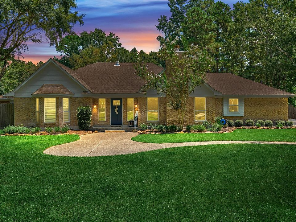ELEGANT REMODEL ON 1.3 ACRE EXPANSE in sought-after Lake Creek Forest zoned to Bush Elem/TWHS! Updated inside & out, this 1-story gem ft. fresh paint thru out incl. cabinets! Dream kitchen offers marble backsplash, quartz counters, dual sinks, reverse osmosis, expanded cabinetry + w/in pantry. True hardwoods in main living areas + new carpet in BRs! Den showcases limestone fireplace w/reclaimed wood mantel + spacious dining room perfect for entertaining! Upgraded fixtures complement this stylish property! Family room w/French doors (opt. office) overlooks this wooded paradise! Split plan w/secluded primary BR w/fireplace & sitting area + updated bath w/impressive storage! 2 en-suite secondary bedrooms w/updated baths + 4th bedroom is opt. flex room! Craft room w/utility alcove + builtin desk & bonus cabinetry! Mudroom storage w/cubbies! Wooded oasis w/heated pool, gazebo, chicken coop, fruit trees, fire pit, koi pond & MORE! GENERATOR! RECENT ACs/Mechanicals! Easy to I-45/Woodlands!