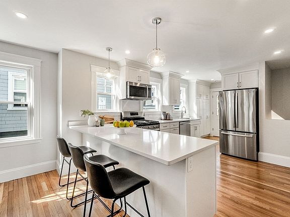 LATE BREAKING OFFER ACCPETED THIS MORNING- OH FROM 12-TO 1 FOR BACKUP OFFERS ONLY. Amsden St. is in a wonderful neighborhood bordering Cambridge, close to Harvard, Tufts as well as Hardy Elementary and the Lesley Ellis School. This full renovation was built with pride and designed with a smart layout. You can live worry free knowing the plumbing, electrical, heating and cooling systems are all new and state of the art. Enjoy Summer outdoors with a shared patio and two porches and keep your car clean and dry with garage parking. What sets this condo apart is quality workmanship and superior products chosen for durability, style and efficiency, like the Schrock cabinets, made in Indiana or the solid core doors by Brasco. But while nearly everything is new, this builder took the time to leave some of the classic details. The original white oak floors on the first floor have been beautifully refinished and the door and window trims were painstakingly matched to the original.