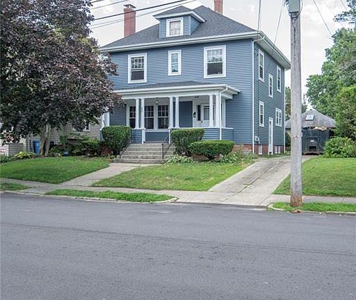 Location! Location! Renovated 1913 Revival Colonial in the heart of Edgewood! Lots of updates! New roof, siding, electrical, plumbing, chimney & flu, and a high-efficiency Navian gas combo heating system. This home was converted to gas and a 4 bedroom. The entire first floor was gutted and redone. There is a long driveway and a detached two car garage with a new roof behind the house. Enter through the charming covered front porch to the huge,bright living room that features gleaming new oak hardwood floors, 9 foot ceilings, and a wood-burning fireplace with built-ins. The spacious formal dining room is perfect for entertaining. The eat-in kitchen is beautiful. It has white shaker cabinets, stainless steel appliances, granite countertops, an island, new luxury vinyl plank flooring, and recessed lighting. The additional finished room off the kitchen would make a great mudroom or home office. Brand new half bath on first floor as well. Upstairs, you’ll find four bedrooms and a gorgeous new full bath with tile floors and a subway tiled bathtub. Spacious hallway closets for storage. There is a large walk-up attic that could be finished for more living space. Close to Edgewood Yaht Club and Pawtuxet Village. Minutes to Providence and Highway. Water views at the end of street. Some replacement windows. Clean and dry basement. Estate sale property. Must see! Call today!