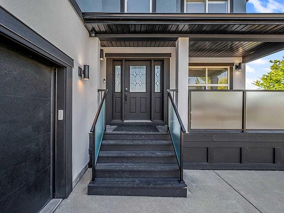 Huge attached garage with a massive front yard and enormous fenced backyard. Exterior has all new fire resistant Acrylic stucco. Elegant curb appeal with black onyx stone and Azure/cream Stucco with matte black wood trim. A curved front driveway leads to the oversized, professionally finished garage with built-in shelving, workbench, and lighting—perfect for the hobbyist. Relax on the covered front veranda or entertain on the newly built deck in your sunny backyard, complete with a firepit. Inside, you'll find brand-new carpet and laminate flooring throughout. The main level features a welcoming living room, formal dining room, mudroom, and a chef-inspired kitchen with new cabinets and quartz countertops, plus a convenient 2-piece bath.