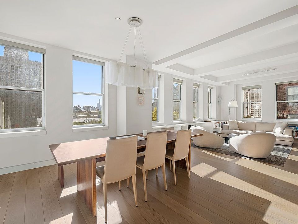 Inside this nearly 2,000-square-foot home, 10-foot-tall beamed ceilings soar above wide-plank hardwood floors and 20 oversized windows on the northern, eastern and southern exposures. A windowed foyer flanked by two huge closets welcomes you into the massive corner living room, where dramatic views skim across City Hall Park to the David Dinkins Municipal Building, the Brooklyn Bridge and Frank Gehry's 8 Spruce. Plan your next dinner party in the adjacent formal dining area and enjoy an open gourmet kitchen with floor-to-ceiling custom cabinetry, a massive waterfall island/breakfast bar and swaths of quartz. A fleet of stainless steel appliances, including a Wolf range, Sub-Zero refrigerator and Bosch dishwasher, makes cooking a joy.
