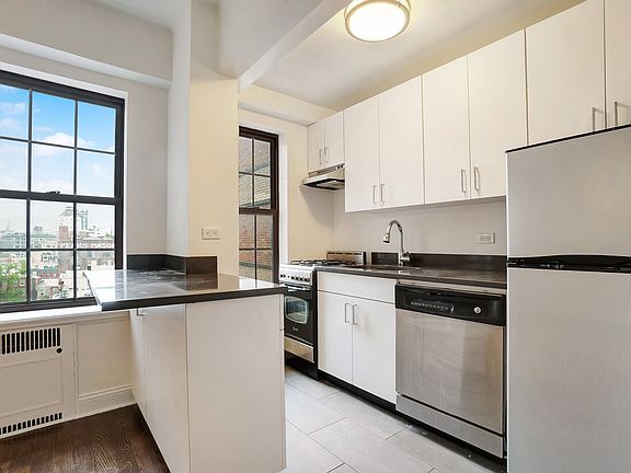 Spacious foyer, apartment features two closets. An open kitchen with full-size stainless steel appliances; copious storage space in the windowed kitchen and good size countertop space. Yes, a dishwasher. No Island as on the photo. Tenants may purchase one at a furniture store.