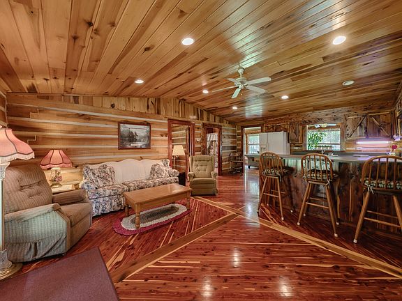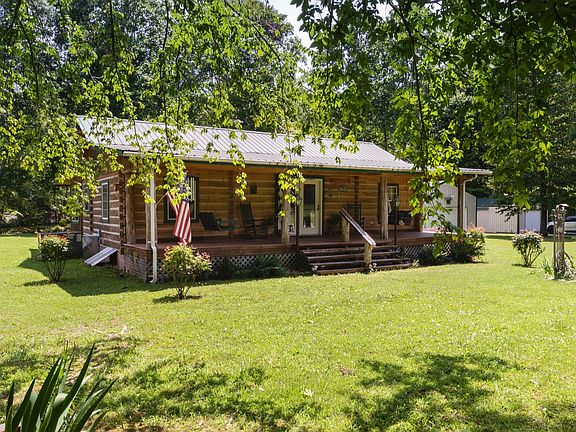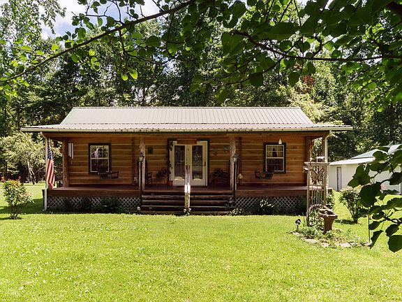 HOT property- Back on market due to buyer financing. Cozy furnished log house! 1/2 mile walk to the TN River/Crooked Creek Marina. Built w/ solid cedar logs, cedar floors/cabinets/doors & poplar ceilings. Large open concept kitchen/dining/living area. Septic hookup for RV. Both well & city water. Large 36x60 shop w/ 1/2 loft & electric. Fish cleaning station & new metal roof at shop. Creek runs through the back of property giving this retreat home the perfect getaway feel.