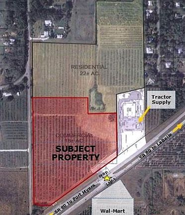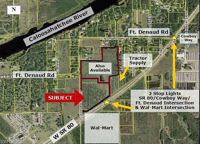 LOCATION! LOCATION! LOCATION! SITUATED AT THE TRAFFIC LIGHT ON THE CORNER OF 4-LANED STATE ROAD 80 AND BEN MOORE DRIVE--THE WAL-MART AND TRACTOR SUPPLY INTERSECTION--This 18+/- acres with 900+/- feet on State Road 80 and 1000+/- feet on Huggetts Road is the prime location for any business! Owners will work with buyers to rezone for acreage and zoning needs and may divide. Property can be annexed into the city of LaBelle for water and sewer lines already at Wal-Mart and Tractor Supply. Wal-Mart paid for traffic light! Current use is improved pasture for cattle grazing. Zoning is Agricultural-2 with Future Land Use as Transitional. Both Hendry County and City of LaBelle will cooperate for solid commercial endeavors! THIS IS THE LOCATION IN SW FLORIDA THAT CANNOT BE BEAT!