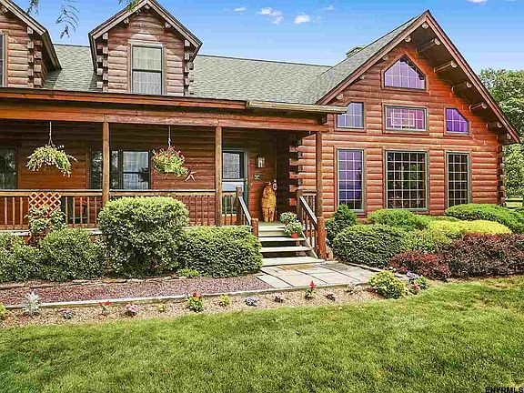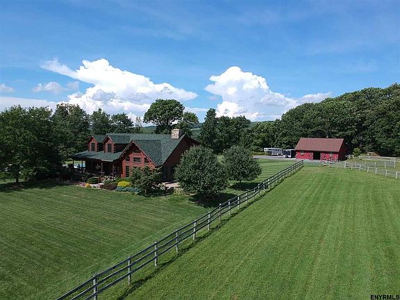 Sit on the front porch & enjoy the breathtaking views of the Catskill Mtns. With the warmth & charm a log home has to offer this home is surrounded by stunning landscape on 8+ acres. The property has all the amenities to entertain family & friends or just get away to recharge. There is a 3-stall barn, fencing & riding ring. The great room is open with a field stone fireplace & soaring log beam ceiling. Country kitchen has been updated w/granite & SS appliances. Great all season location.
