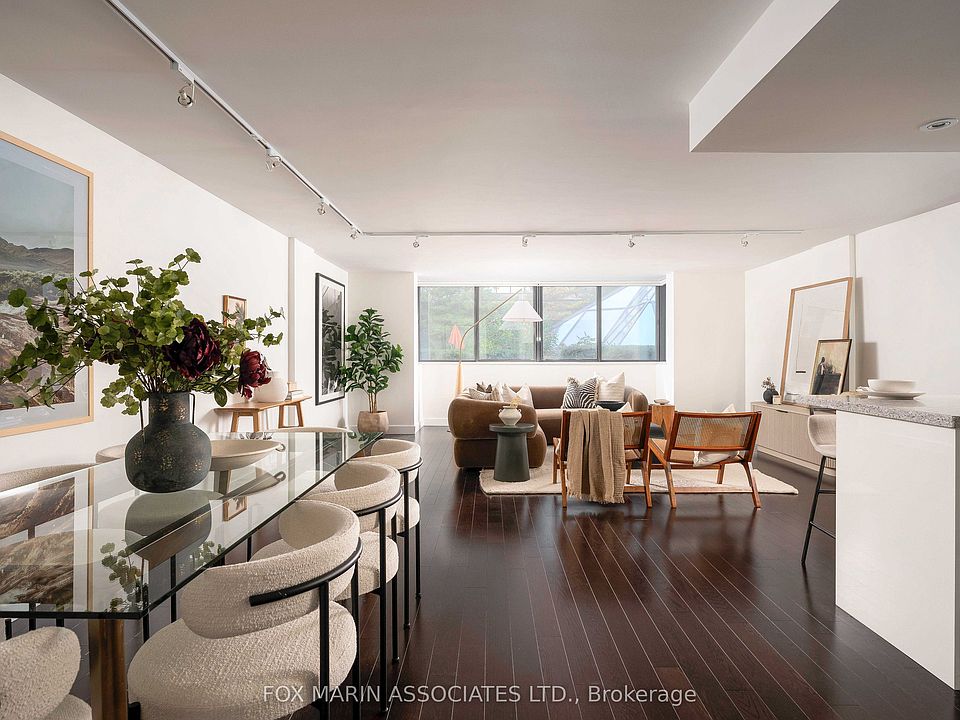 An oversized two-storey residence that feels more brownstone than condo, a home collected, not constructed, with a splash of that Market Square buzz. Walk into a cinematic great room framed by gallery-white walls, moody floors, and light that shifts beautifully from east to west throughout the day. An open-concept main level designed for real life, equal parts hosting & retreating, with defined flow, warm entry moments, and practical storage right where you need it. Windows wrap the spacious living area in courtyard greenery, giving a townhouse-in-the-city feel that makes this double-decker one of only a handful in the complex. A fully reimagined eat-in kitchen finished in glossy white with quartz counters, a mirrored backsplash, and integrated Liebherr, Porter & Charles, AEG, and Miele appliances. Thoughtful lines and symmetry, clean cabinetry, a hidden pantry, and a layout that balances visual restraint with culinary practicality. Included? A dining moment straight out of Azure Magazine with proportions that invite long dinners and lively conversation, easily seats eight & connects effortlessly to the main-level powder room.Retreat to the second floor for a primary suite that welcomes slow mornings; east-facing light, rich hardwood, and a sense of scale that rivals a luxury hotel. A spa-level ensuite that embraces simplicity with confidence: frameless glass, neutral tiling, and subtle contrasts between warm and cool tones, topped with a spacious walk-in closet with floor-to-ceiling built-ins.Down the hall, your generous second bedroom is topped with its own private ensuite, perfect for guests, teens, or a sophisticated in-home office. Bonuses include a dedicated upper-level laundry room, ensuite storage, and separation of space, making day-to-day living refreshingly easier. This is full-service living with a 24-hour concierge, rooftop pool, gym, sauna, squash courts, and landscaped terrace overlooking the best neighbourhood in the city.