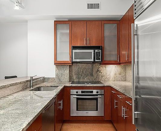Soaring 10’8” beamed ceilings and two oversized windows bring character, charm, and an abundance of light, creating a dramatic sense of space well beyond its footprint. The open chef’s kitchen is a standout feature, boasting granite countertops, a Sub-Zero refrigerator, Bosch oven, cooktop, and dishwasher, plus a GE Profile microwave. Rich cherrywood cabinetry provides elegance and exceptional storage.