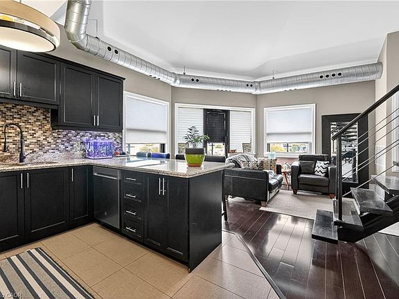 URBAN ELEGANCE IN THE HEART OF DOWNTOWN … Experience the best of downtown living in this stunning 2-storey PENTHOUSE condo at 404-80 King William Street, part of the coveted FilmWork Lofts - a boutique building steeped in history and modern design. Once home to the Hamilton Spectator printing press, this unique conversion blends industrial charm with contemporary style, offering a one-of-a-kind urban lifestyle. Step inside and discover a bright, open-concept layout where soaring ceilings and exposed ductwork reflect the building’s authentic character. The living room, finished with warm HARDWOOD flooring, flows seamlessly onto your northeast-facing corner balcony, perfect for morning coffee or evening relaxation. The kitchen features GRANITE countertops, ceramic tile flooring, and stainless-steel appliances, creating a sleek and functional space ideal for the home chef. This thoughtfully designed loft includes two spacious bedrooms and two full 4-piece bathrooms, offering both privacy and comfort. The PRIMARY BEDROOM SUITE is located on the upper level and enjoys natural light and an airy sense of openness only a true loft can provide. Additional conveniences include in-suite laundry, one underground parking space, and a LOCKER (#3272) for extra storage. Owners can also enjoy BBQ privileges on their private balcony. Built in 2010, FilmWork Lofts is home to just 38 live-work lofts and 12 exclusive penthouses, creating an intimate community for professionals and creatives alike. Its prime downtown location boasts exceptional walkability - just steps to the Hamilton GO Station, Farmers Market, and the James Street North Arts District, known for its galleries, boutiques, and vibrant culinary scene. With a Walk Score of 85, Transit Score of 88, and Bike Score of 91, this property embodies the convenience and culture of true city living. Live. Work. Thrive. Downtown. CLICK ON MULTIMEDIA for virtual tour, drone photos, floor plans & More.