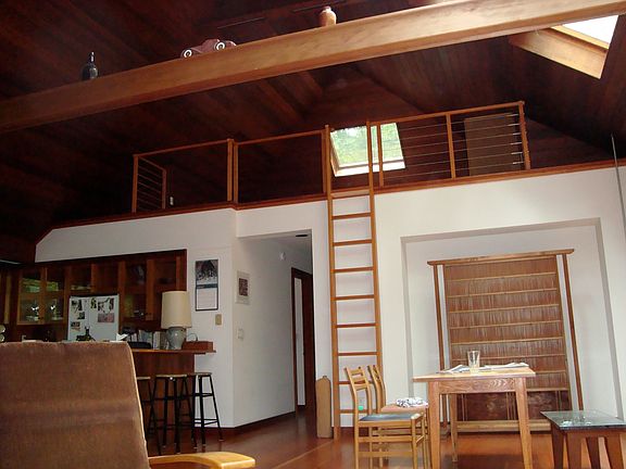 Japanese inspired house, 1900 sq ft, 2 bedrooms, 2 baths, 2 sleeping lofts, redwood ceiling, modern kitchen, redwood windows & doors, built-in cherry cabinets, huge stone fireplace, 10 large skylights, glass doors, cedar deck & porches surrounding entire house, new cedar decking, new cedar shake roof, AC, central vac, numerous closets, laundry room, redwood siding, full dry basement, separate 1100 sq ft studio/workshop/office, heated, with 5 large skylights, large glass windows, sited on 5 acres heavily wooded with maples, red & white oak, hickeries, juniipers, american beech and more. Property off quiet road outside Cold Spring, NY, 3 miles to town, very private property & very private site, metro north railroad 3 miles, low taxes